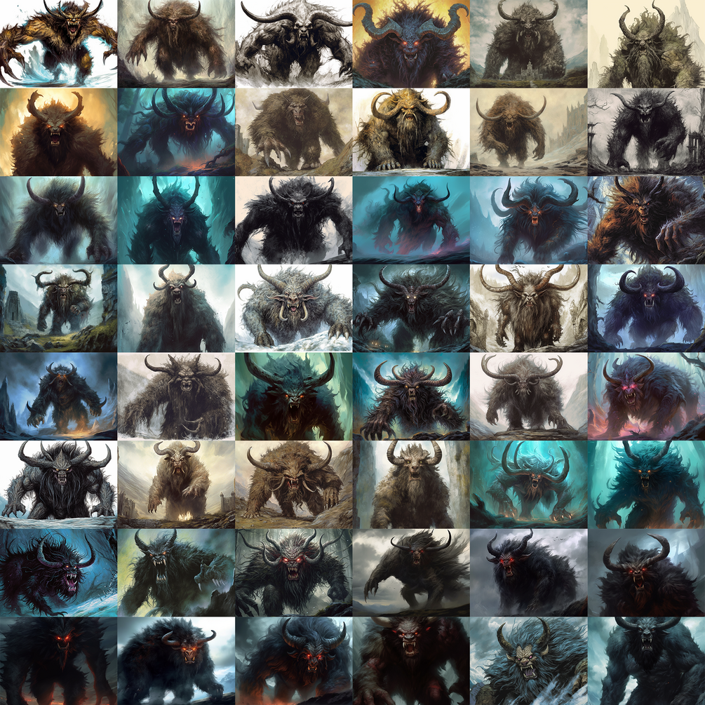 200+ reference images, around 11.5 Gb of Buggane, a creature from Manx folklore, generated by MidJourney and upscaled with Topaz Gigapixel AI