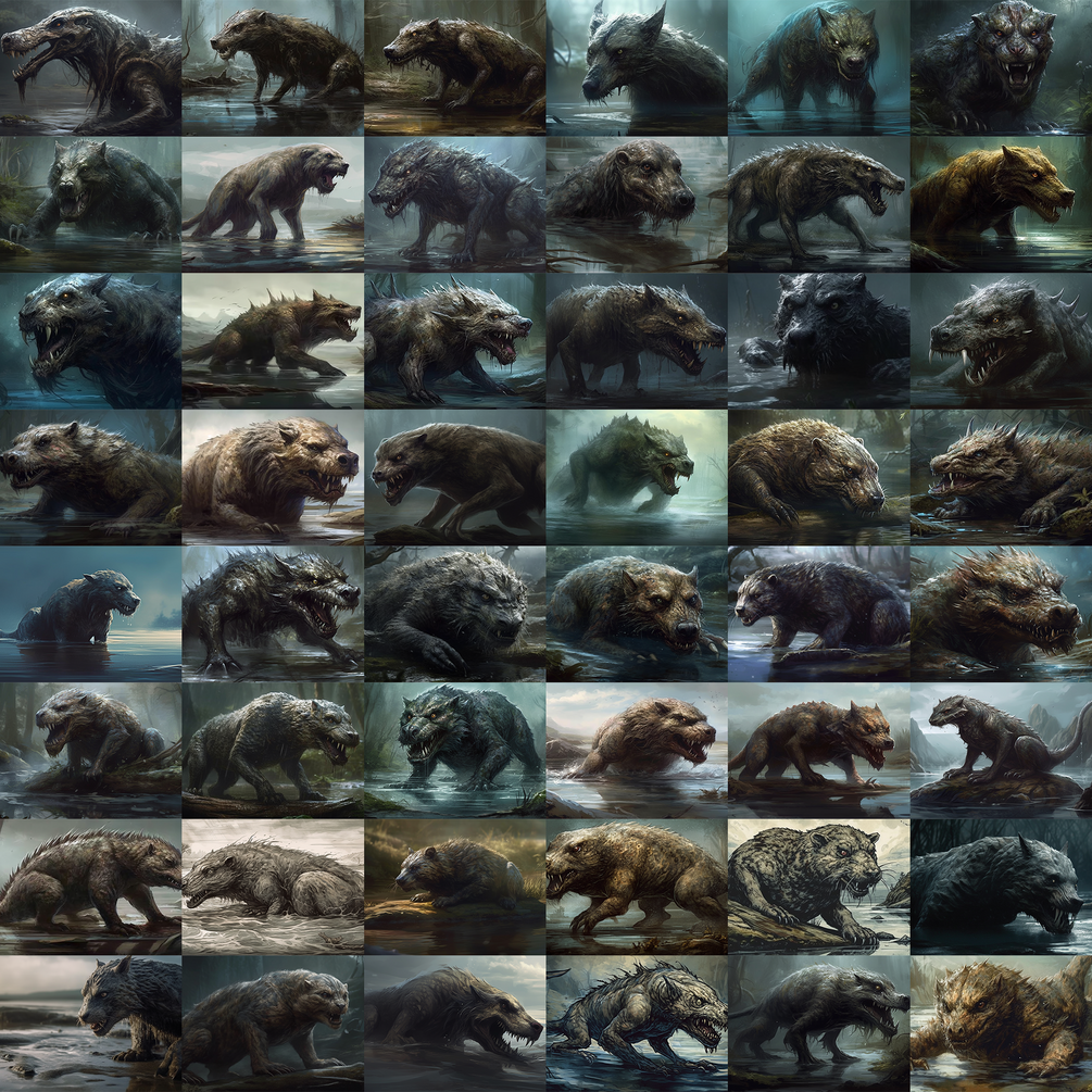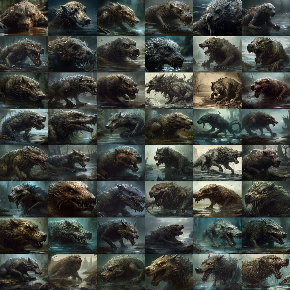 200+ reference images, around 9.6 Gb of Dobhar-chu, creature from Irish folklore, generated by MidJourney and upscaled with Topaz Gigapixel AI